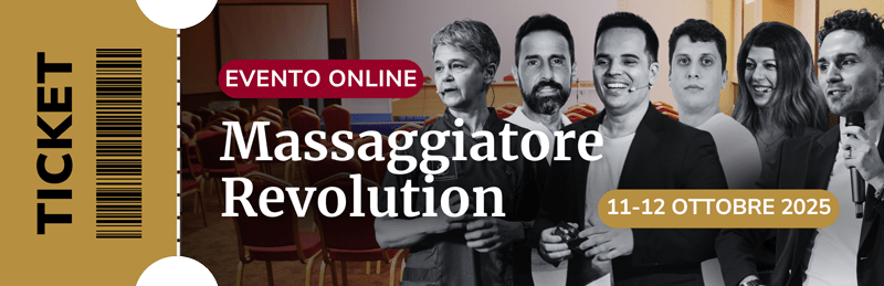 Massaggiatore Revolution è il primo evento LIVE di 2 giorni dedicato agli operatori olistici che vogliono smettere di sentirsi uno tra tanti e iniziare a posizionarsi come veri professionisti in grado di attrarre clienti ogni giorno, senza svendersi e senza inseguire nessuno.